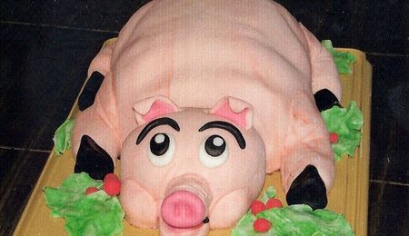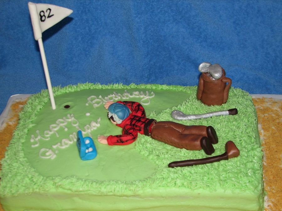 Full picture of the cake. Grandpa is blowing the ball into the hole. He has an egg carton there since he keeps his balls in one. Cake is chocolate with whipped Toblerone ganache filling, iced in buttercream, and MMF pieces.