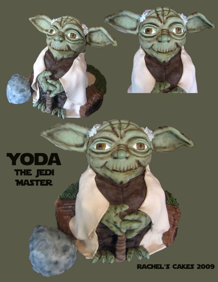 yoda made using 3D bear pan, sitting on 10" round cake. Ears are gumpaste, rest is fondant. TFL