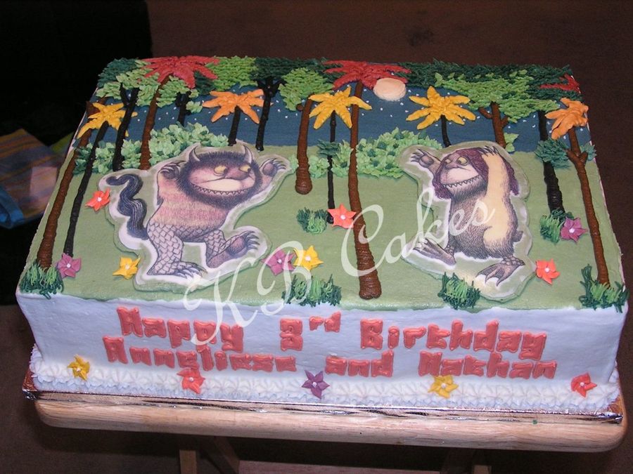 2-layer 12 x18 FBCT of Where the Wild Things are Characters. The background is piped in with trees and vines. The flowers are royal icing.