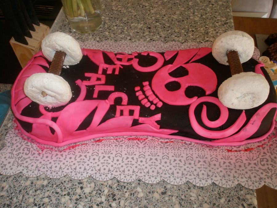 My daughters 12th birthday cake. I made the black fondant out of chocolate fondant and then used the wilton black spray. The hot pink is mmf with the wilton pink spray