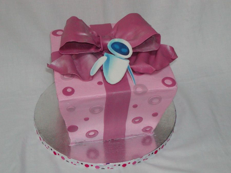 I made this for my dd's 5th birthday. She wanted a Wall-e birthday. I came up with this to make it a little more girlie. Stacked 10",9" and 8" square carved to even out and iced in buttercream, fondant accents and bow . Eva is an edible image cut out on gumpaste.