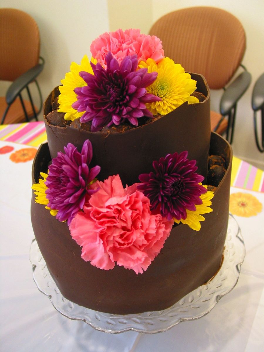 Chocolate cake with mocha buttercream filling, chocolate buttercream frosting and wrapped with plastic chocolate. I also used the extra cake and mocha buttercream to make truffles that were then dusted with cocoa and then used to fill the top....and then accented with fresh flowers.