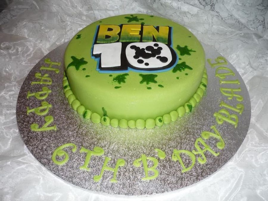ben 10 cake for a six year old boy, all he wanted was a green cake with something to do with ben 10. Plaque is made with gumpaste and the splats are green piping gel. cake is chocolate. thanks for looking...