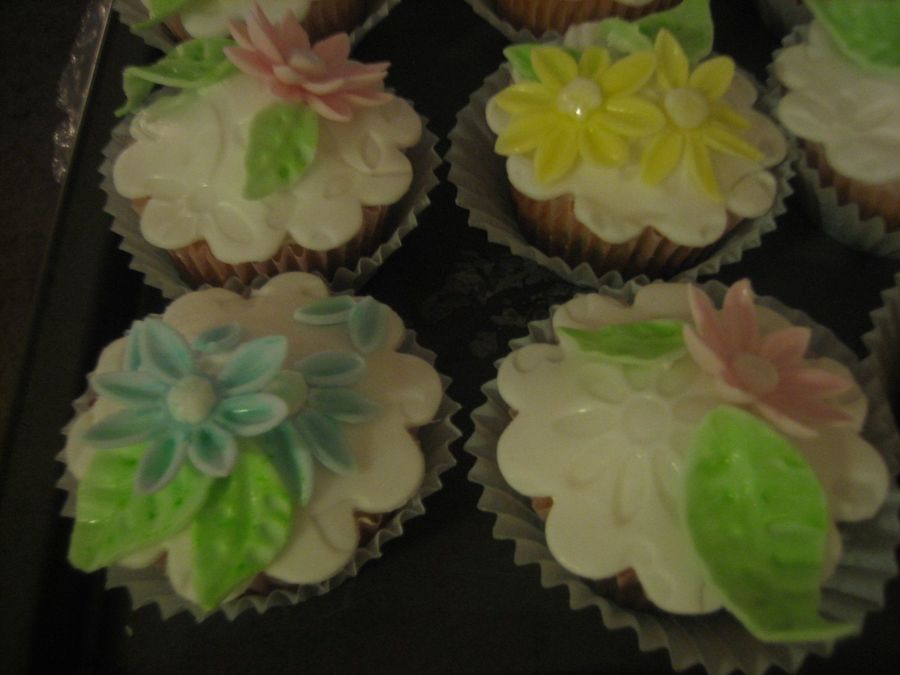Made this as favors for my sisters' birthday party. Mini morsels cupcakes with rolled fondant topping and flowers.
