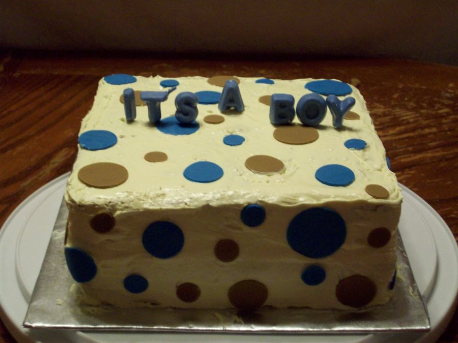 This cake is butter cream frosting with gum paste dots and chocolate letters.
