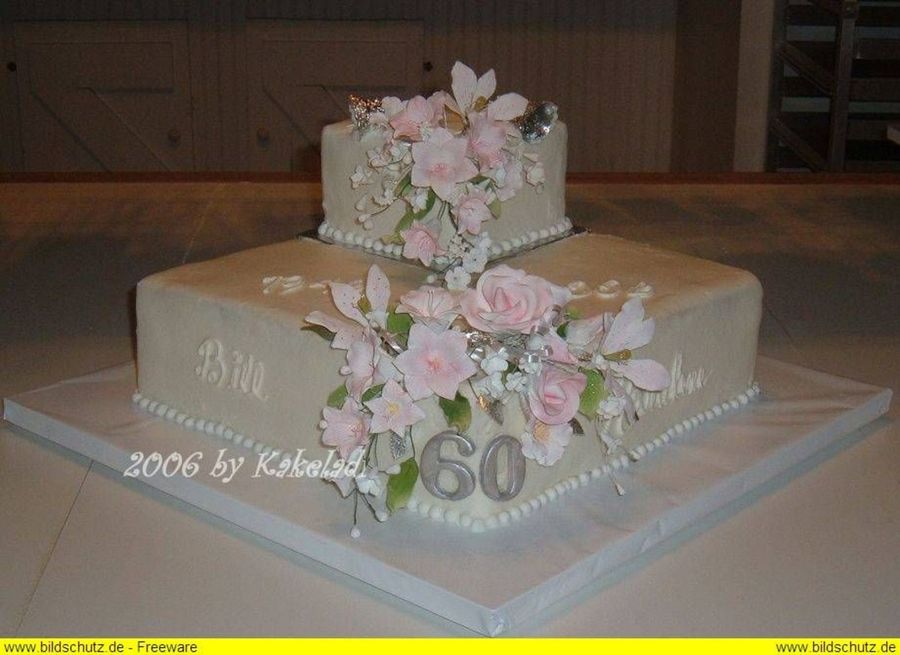 How many of us get to make anniversary cakes for 60 years? What a privilege this was. 14x4 and 6x4" tiers covered in buttercream. Flowers are commercially made gumpaste corsages dusted with pink petal dust. Silver foil leaves; Numbers fondant painted w/luster dust mixed w/vodka. Could be used for anniversary, small wedding, engagement, or even a lady's birthday