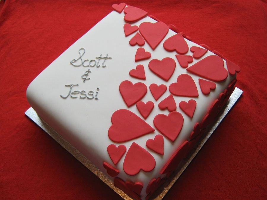 Rich chocolate cake, white chocolate ganaech and rolled fondant with fondant hearts.