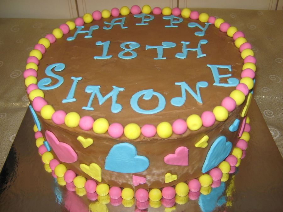 Rich chocoate cake, with White chocolate Ganaech coloured brown, and fondant balls and hearts.