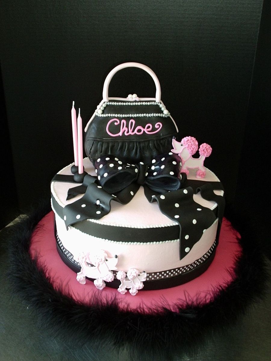RCT purse covered with fondant, gumpaste poodles decorated with Royal Icing