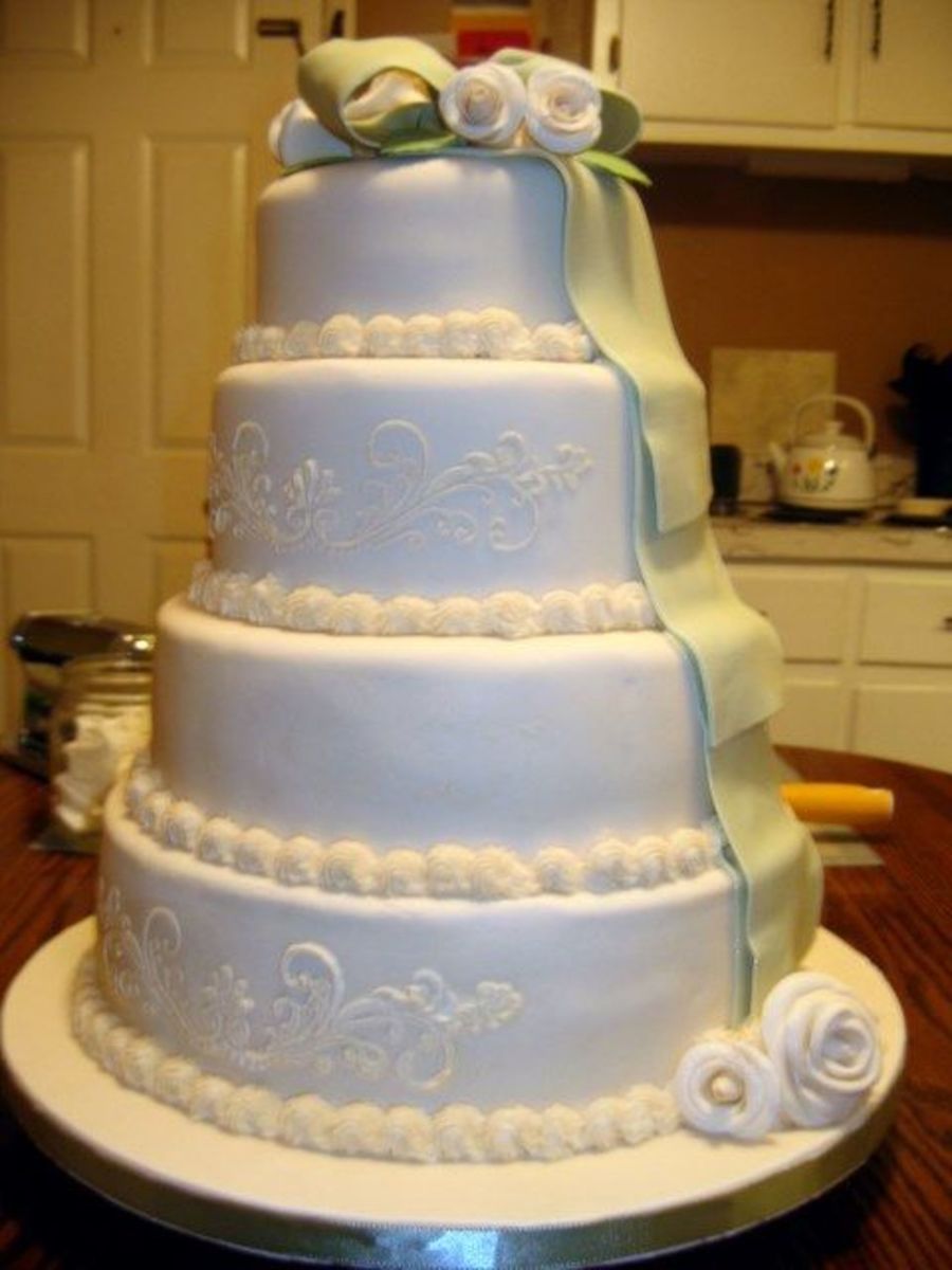 4 tier - chocolate, pound cake, and red velvet. Covered in fondant with gumpaste roses and bow.
