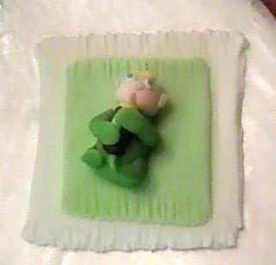 3-D out of fondant, of a baby clasping a bottle on his blankie. I made this for a baby shower cake. Baby is handmade, without a mold.