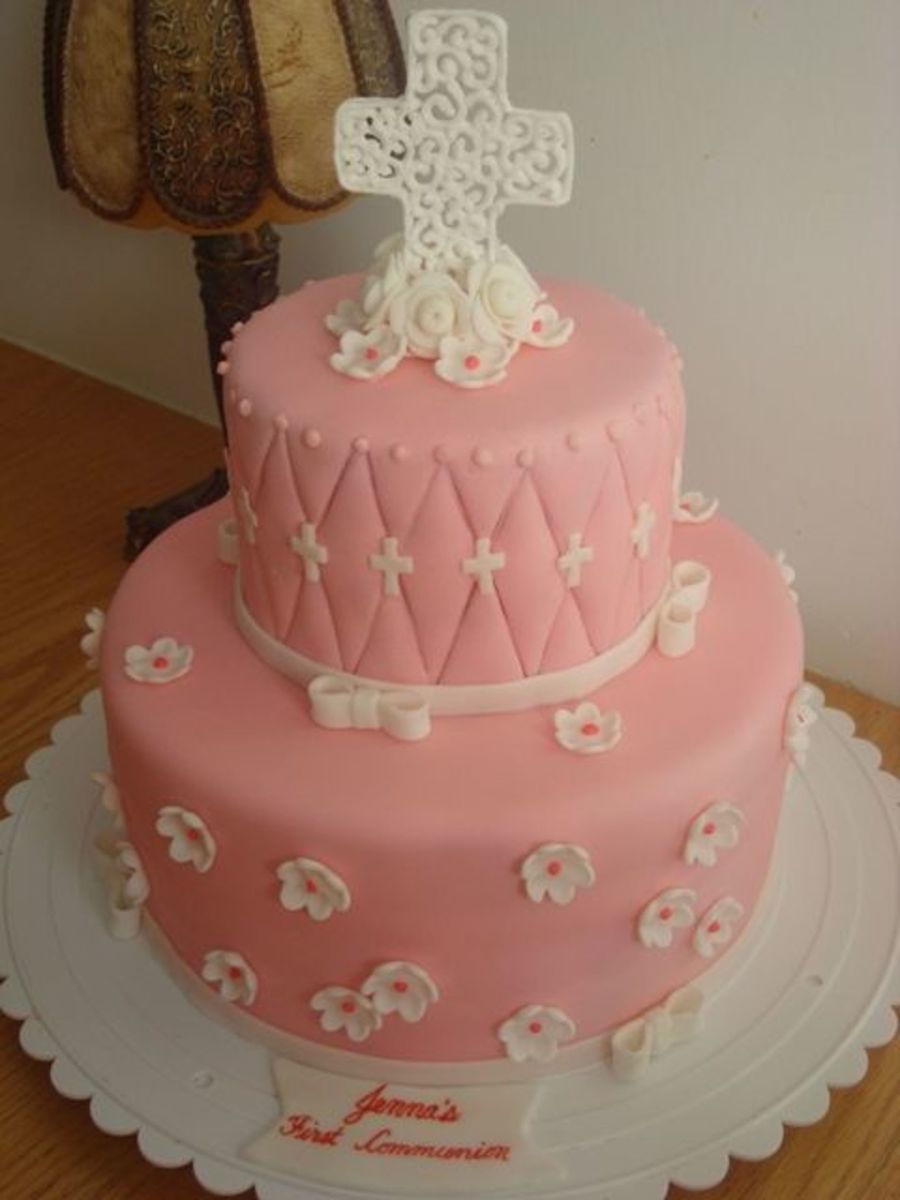This is a cake I made for a cousin's daughter...she loves pink. Cake is decorated and covered in fondant and I made the cross freehand from royal icing. Thanks for looking!