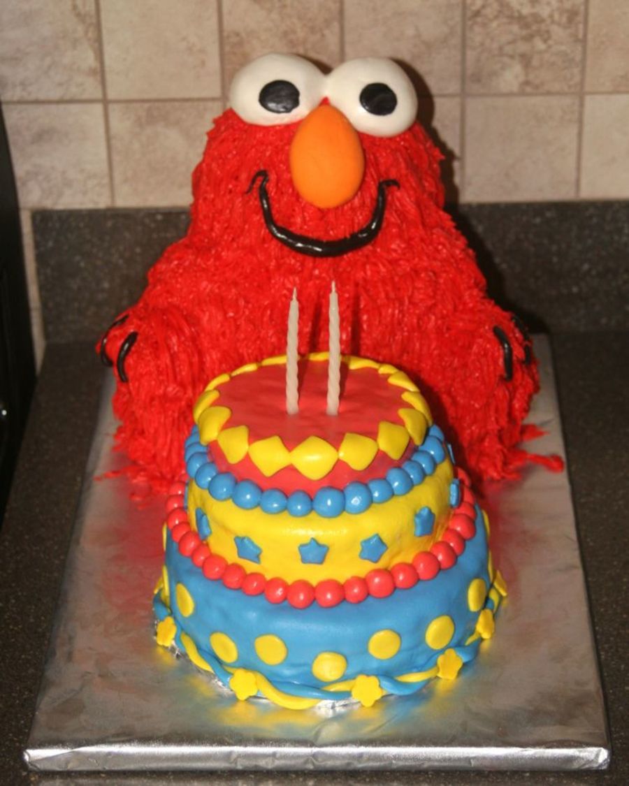 This is a 3D elmo cake I made for my son's second b-day. Used panda pan, grass tip with b/c icing, and fondant features. Elmo's b-day cake was made from 3 6" cakes. Thanks for looking!!