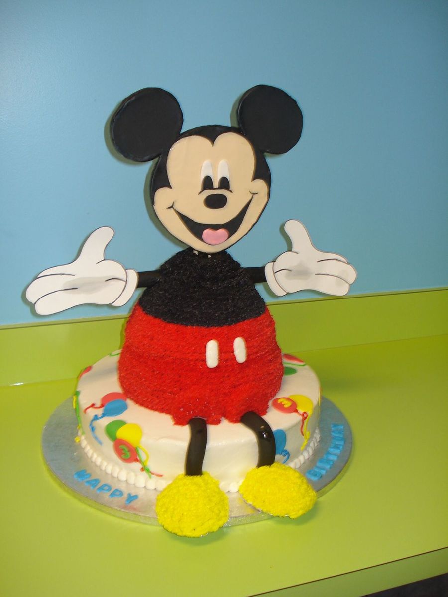 This is the Mickey Mouse cake from the Wilton 2006 yearbook minus the chocolate head....after buying all the pans and supplies needed for the cake I found out the Mickey head pan has been retired!!!! Thanks to Spills for rescuing me and sending a Mickey picture as well as providing great tips , I ended up making it out of fondant and putting it on a cardboard cut out. Also, thanks to Cambo for her help, she's such an awesome person! I used carstock for the hands, you can see the white chocolate I used to attach to the arms...oh well, by that time I was just happy to be finished. I used summernoelle's WASC Chocolate Cake recipe for the body, omg, everyone raved over it, this will now be the chocolate cake recipe I'll use going forward. 14" bottom was WASC Wedding Cake, balloons were made with fondant. This was a fun cake once I got past the head issue, my Grandson absolutely loved it! Thanks for looking!