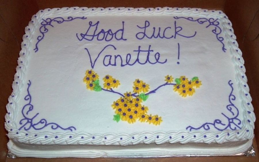 This cake was for a girl at our office who was leaving for another position. Cake is white chocolate with butter rum flavored icing. All BC.