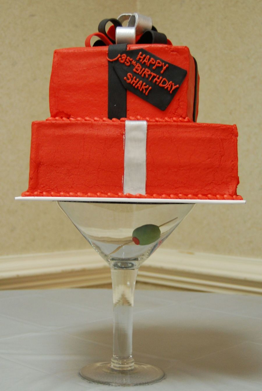 2-tier gift boxes iced in red buttercream with fondant ribbons and bow. Cake was set atop a giant martini glass with a fondant olive inside.