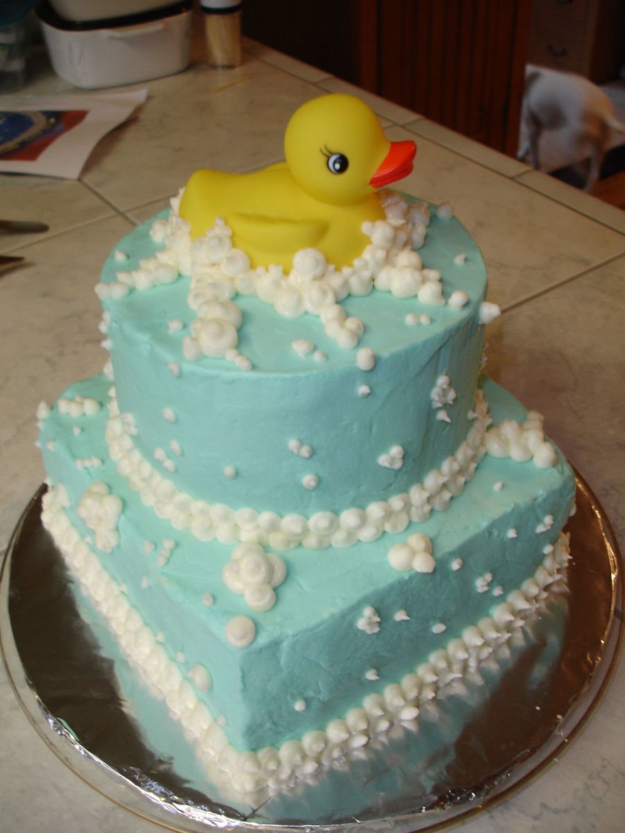 2-8 inch squares, chocolate devils food and 2-6 inch rounds, butter recipe yellow cake. buttercream icing over all. The duck is a bath toy.