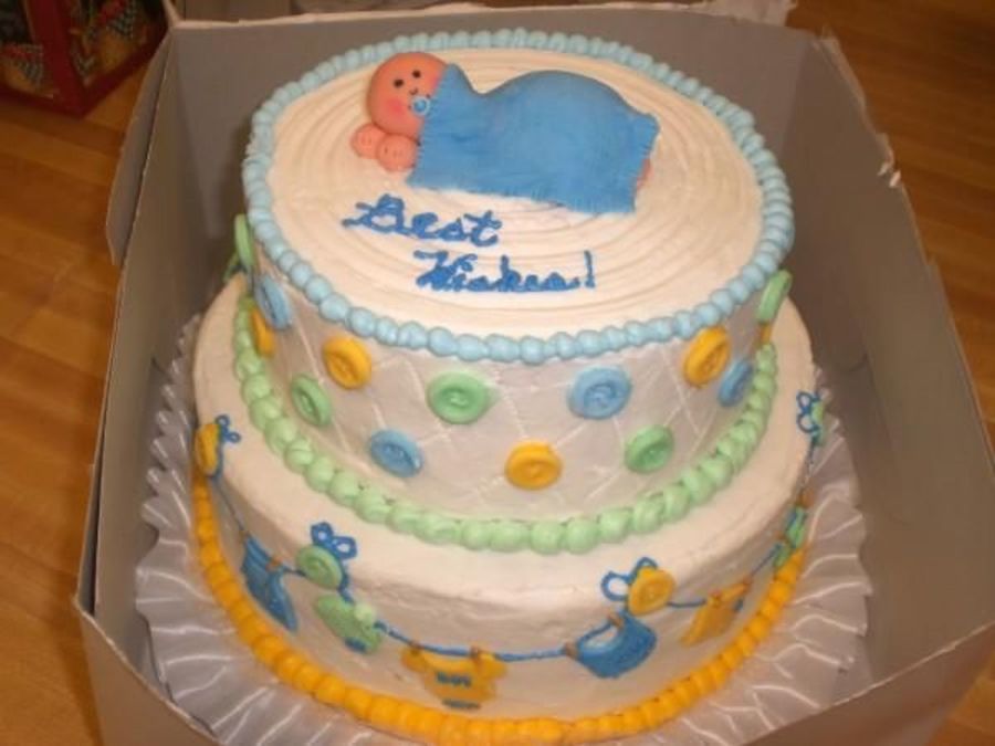 I loved doing this one! The cake was made to go with the "clothes line" baby shower theme. Each button and piece of clothing was done with fondant as well as the baby on top! Cake is vanilla with buttercream frosting.