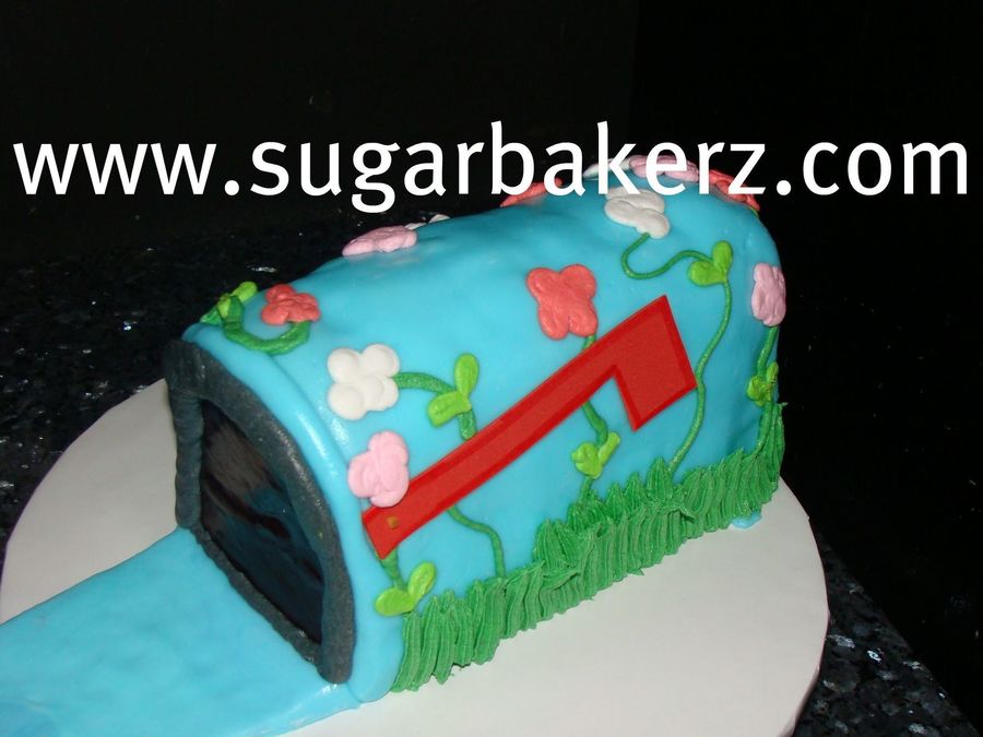 This was done for a woman retiring from the PO... done with 3 4" rounds cut in 1/2 and placed on their flat sides down on top of a 2 layer loaf pan cake. Iced in BC and covered in RBC. Floral work is BC. Flag is foam art board attached with a toothpick. Customer wanted the cake to be feminine and to looke like it had been "grown over with time" Fun cake, customer loved it.