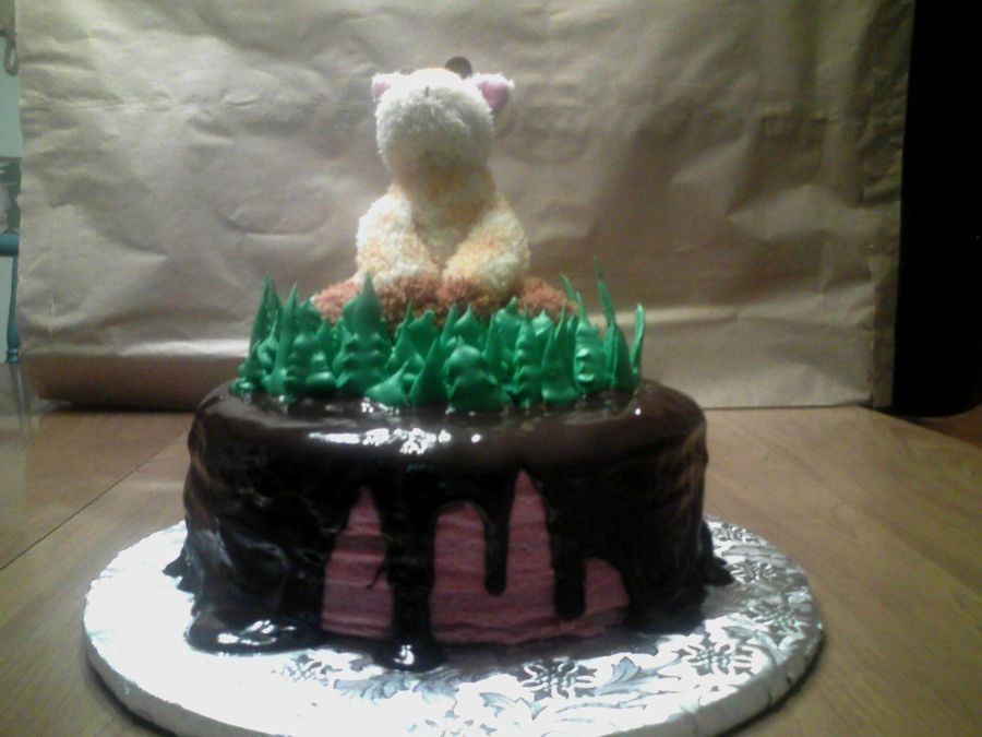 Six Layer Raspberry-Laced Vanilla Cake covered in a Dark Chocolate Ganache. Grass was made with royal icing. Giraffe is a small plush toy.