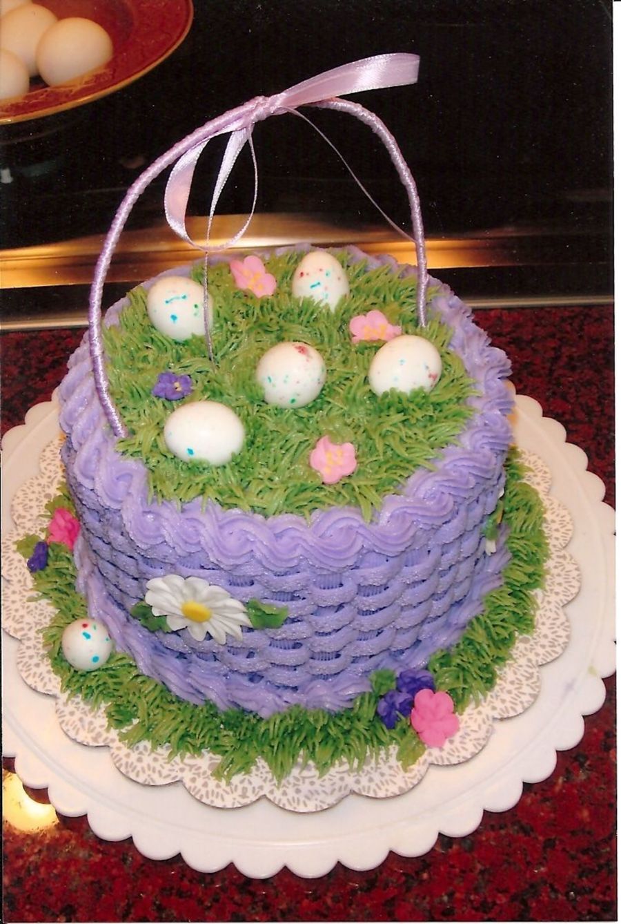 I was just dying to try out my new grass tip and practice my basketweave technique, so here it is. All buttercream with royal icing flowers, and robin's eggs. The handle is a hanger wire wrapped in ribbon. I stuck it into straws that were in the cake