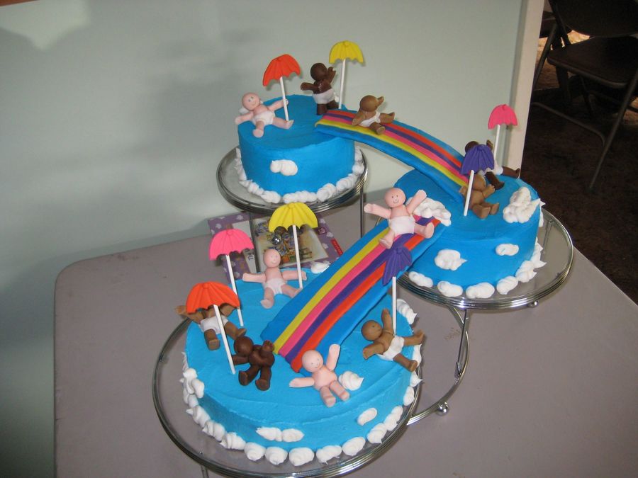 The cake is covered in buttercream and the babies / rainbows are made of fondant.