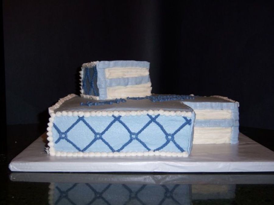 My church friend saw the missing piece cake I did last week and requested one for her daughter's birthday. It's WASC with strawberry filling and buttercream. I also wanted to try the piping technique on the sides that I saw in Martha Stewart's Wedding Cakes book. Practice, practice, practice -- I refuse to give up!!!