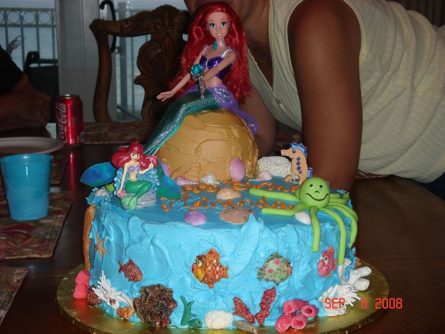 Cake for niece's birthday - Ariel under the Sea. Some fish and coral are made from molds and some coral, turtle, octopus are free hand. All hand painted by me and some help from my 4 yr old who is really into working with fondant.