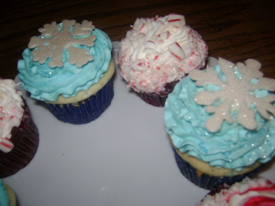 snowflakes are made out of white chocolate that I free hand piped and painted with luster dust. The red and white ones are red velvet with buttercream frosting that I rolled in crushed candy canes... so yummy!!