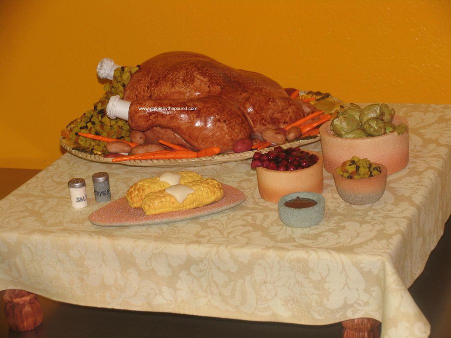 This picture we a completely edible turkey dinner, Everything, including the bowls are edible. Well of course not the table and table cloth but the other stuff is either cake (Turkey, stuffing and corn) or Fondant (cranberries, brussels sprouts, butter) or sugar (the bowls). enjoy