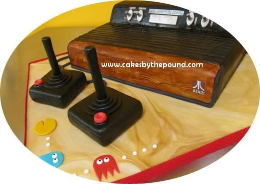 This lovely game console is completely edible. It is all cake covered in fondant. The Joysticks are cake with poured chocolate handles wrapped in fondant. The board is foamcore covered in fondant. But we thought it brought back some nastalgia