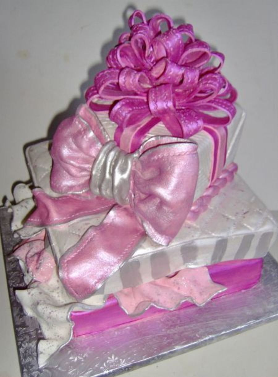 Pink, silver and white gift box hand painted cake