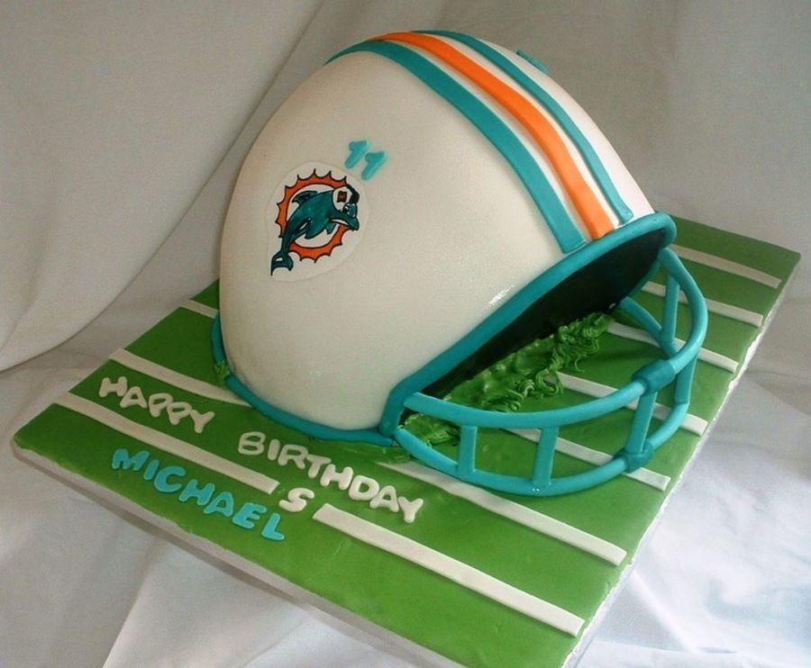 A chocolate cake with SMBC for my nephew's 11th birthday. He is a diehard Dol-fan!! Win or loose. He said if his NFL career does not takeoff, he will become a baker. I carved two 10" layered cake, 1-6" to make the helmet. The Dolphin I drew on sugar paper and colored with gelfood color. The face grill I made with gumpaste. As usual I broke them and had to patch them! My nephew plays Impact football and his number is 5 (just at the 5-yard line!!). TFL.