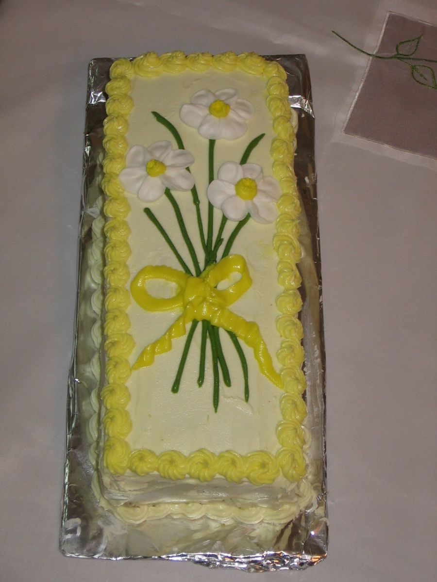 My first attemp at royal icing flowers. The cake is a 9x13 cut into thirds and stacked.