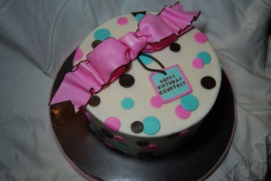 8" round cake with fondant polka dots. bow and tag also fondant.