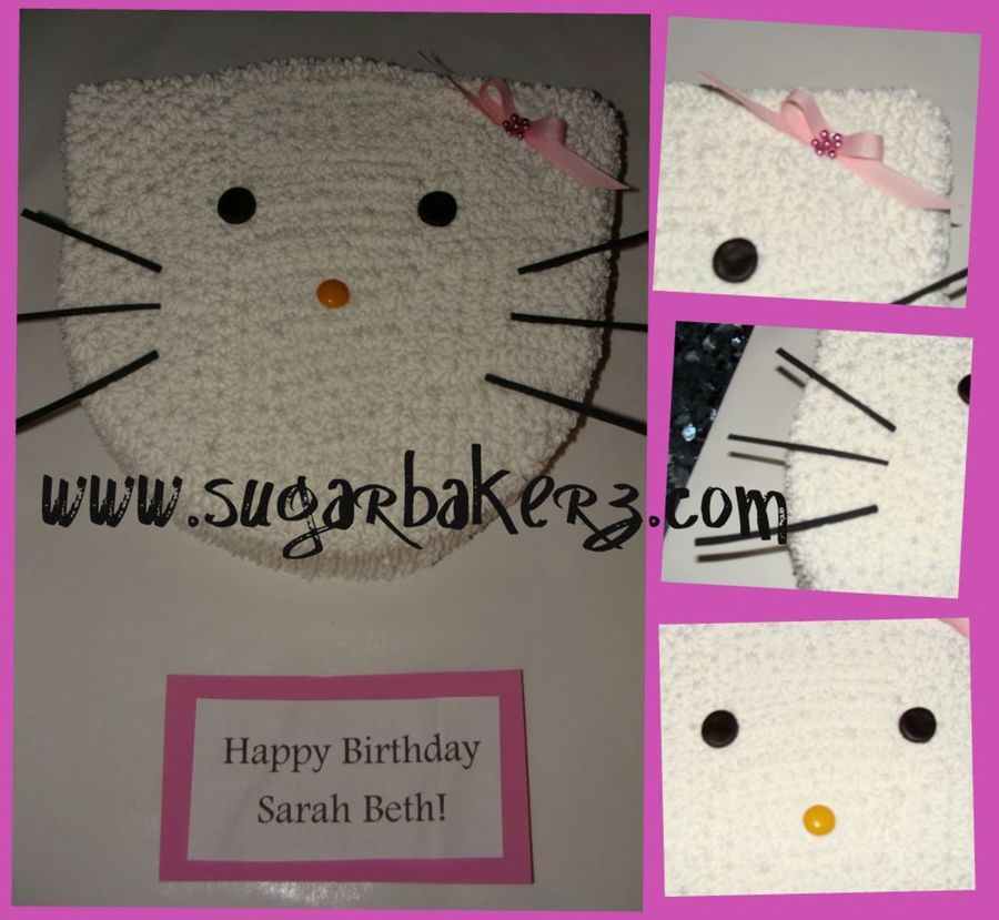 Designed after CAMBO's Hello Kitty cakes, done for a friend of mine. Cake was done with a 9" round and the ears were carved from a 4" round. Cake was iced in BC. Chocolate Pettinice for eyes, M&M for nose and foam for whiskers. Bow is real ribbon secured with icing and then accented with dragees. Fun cake!
