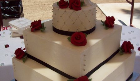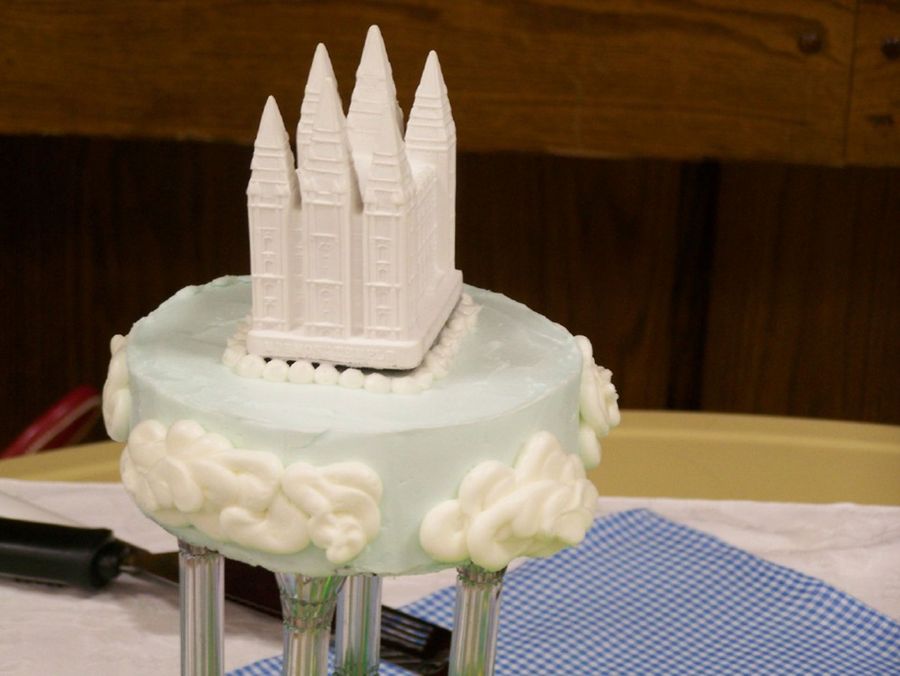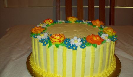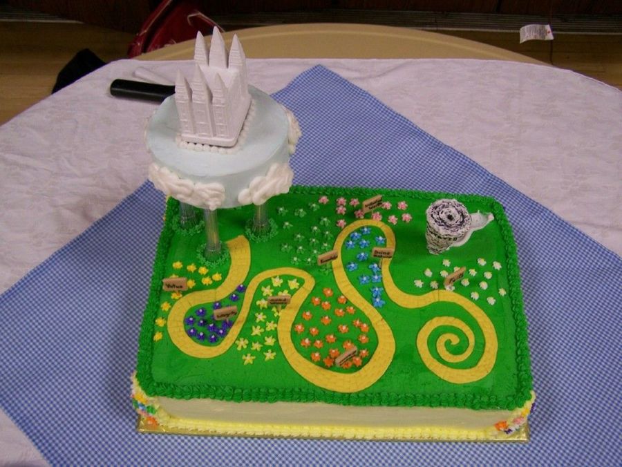 This cake has 2 layers (chocolate and cherry chip) and has a vanilla mousse filling with almond buttercream frosting. The design is taken from the Wizard of Oz and applyied to LDS Young Women's Evening of Execellence. Each of the flower areas represent a value and the ultimate goal is the temple. My twist on it is, if you stray from the path, you will run in to disaster. Hence the torando is labled temptation.