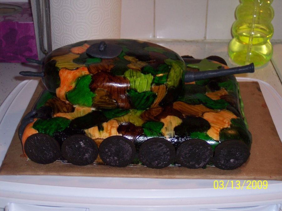 Hand painted camo on fondant. all fondant accents oreo wheels. Made as a gift for a 9yr little boy. What a blast this cake was to make!! tfl