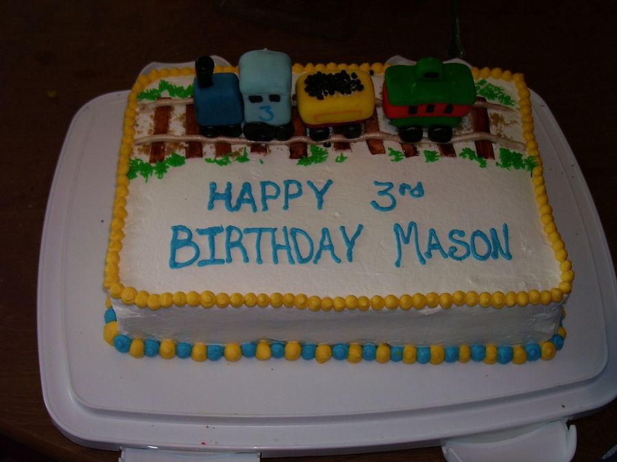 Made this last minute for my son's 3rd birthday...he loves trains! The train and track are made out of fondant. The rest is BC frosting.