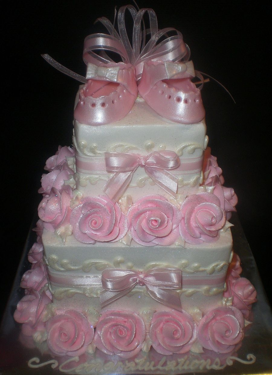 Layers of white with straberry mousse and chocolate with caramel mousse. Iced in bc with bc roses snd scroll work. and baby shoes are made of fondant. The entire cake is pearlized and glittered as a finishing touch.