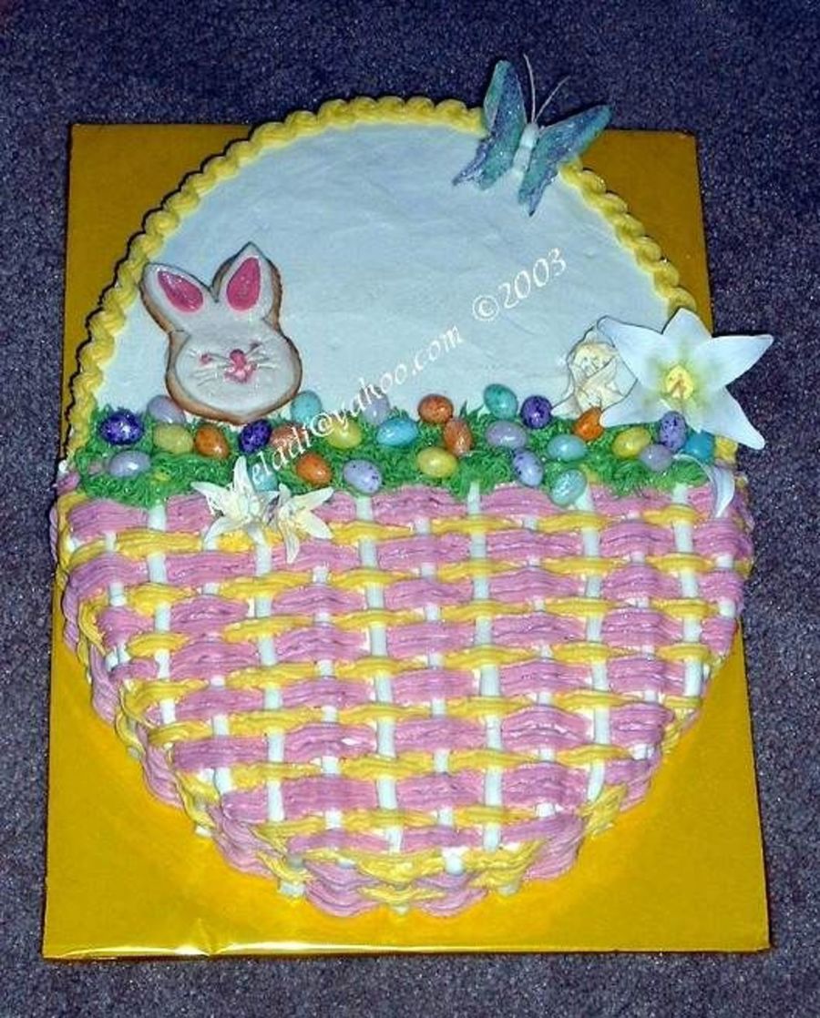 The largest oval pan is used for this Easter basket. A cookie bunny peeks out of the jelly bean eggs. Wafer paper butterfly; flowers are royal icing lilies and a gumpaste one.