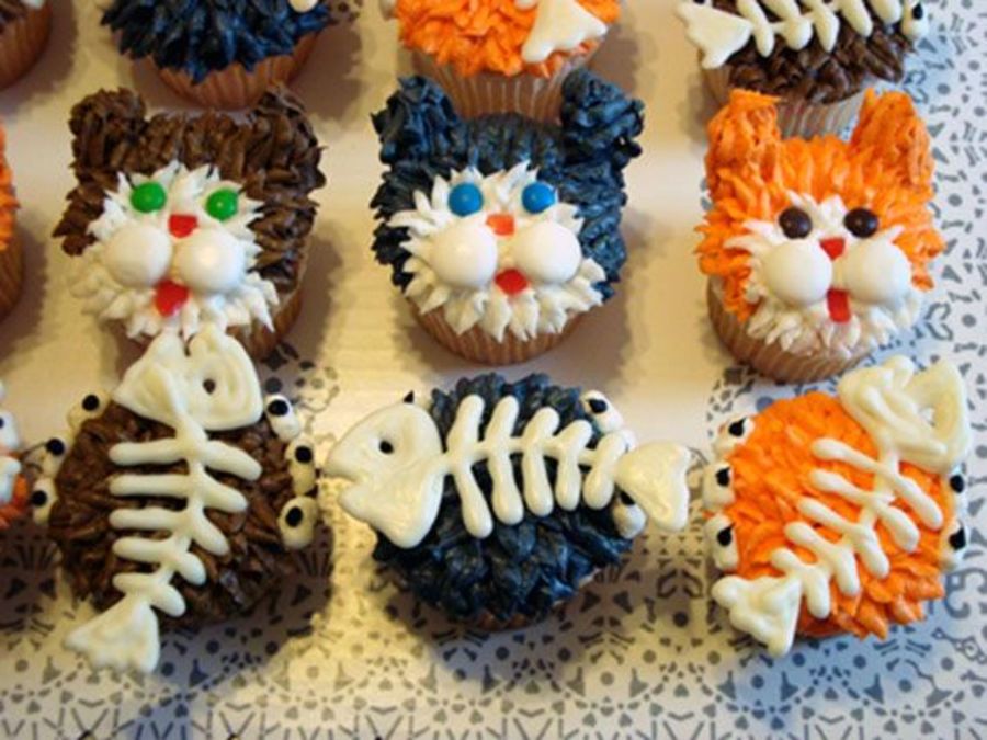 Yel. Cupcakes. All BC Icing. Ears - Ginger Snaps. Eyes - M&M minis. Nose/Tongue - Fruit Roll Ups. Cheeks - Mentos. Fish Bones - White Cho.
