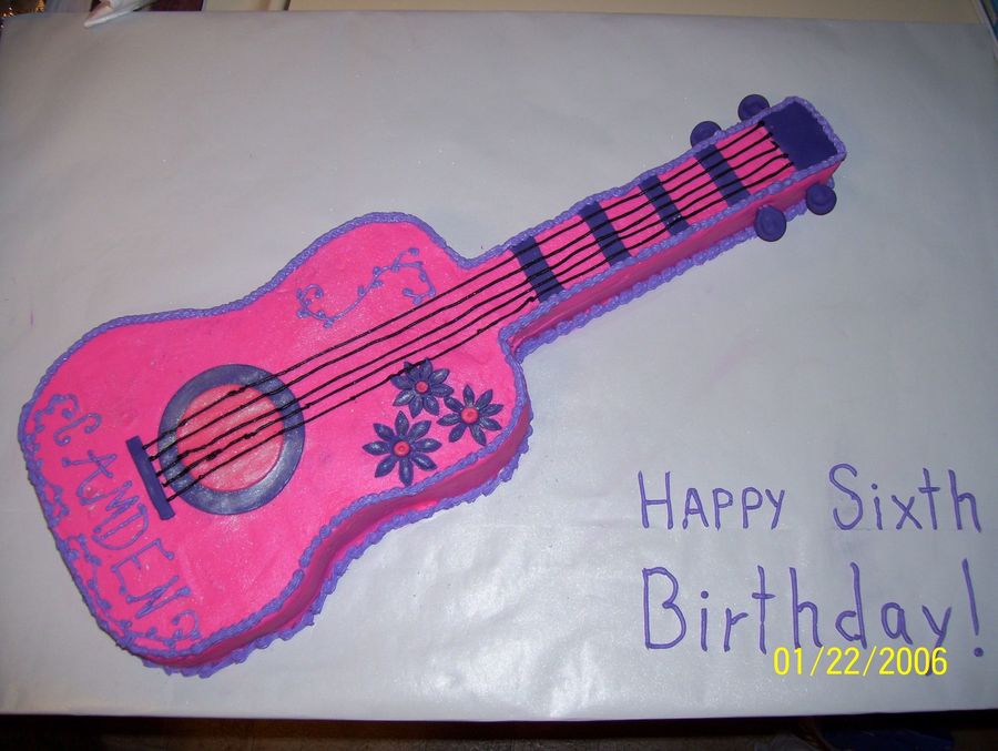 Made for a little girl's rock star party. The handle is made of rice krispies. The base is a 9x13 carved. Buttercream with fondant accents. The strings are also buttercream.