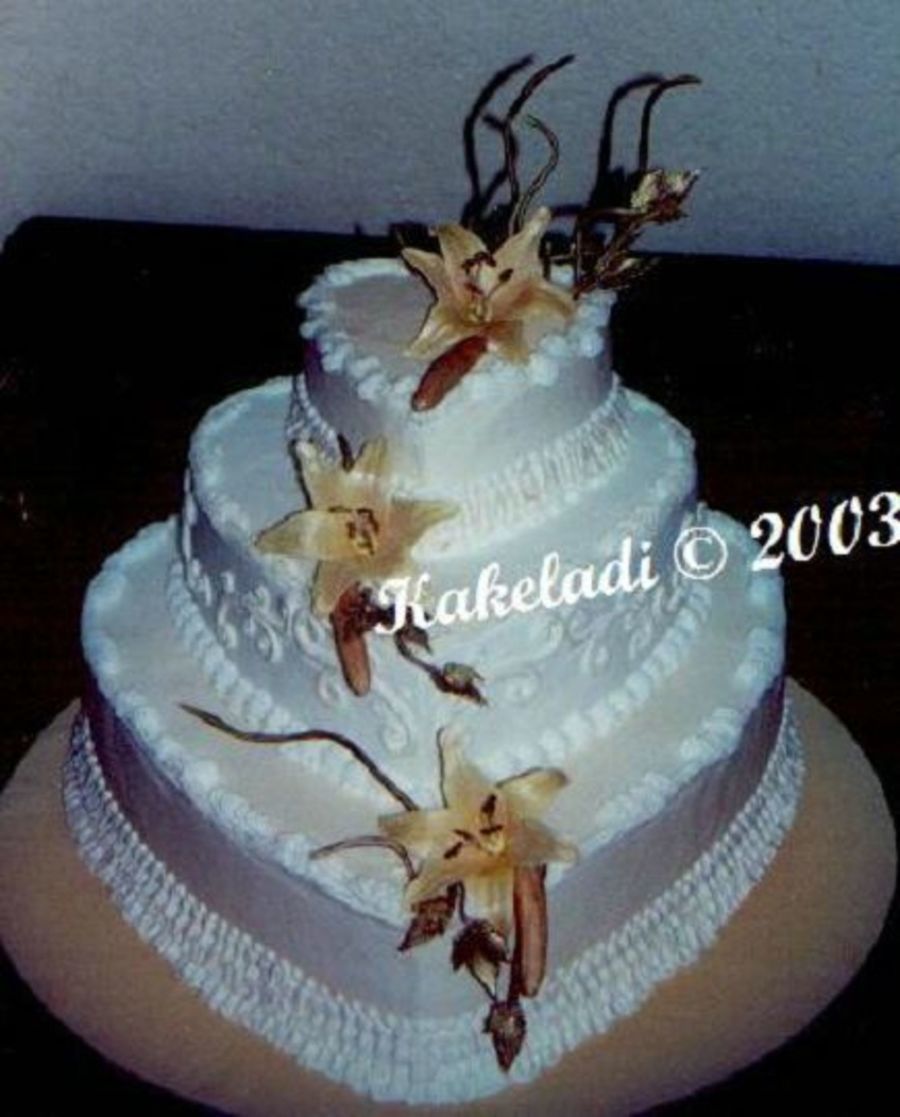 The heart tiers are 15, 10, 6; iced in buttercream - top & bottom tiers in ivory all other decorations in white. Lilies are fondant. Twigs & cattails are chocolate clay. This remains one of my favorites :)
