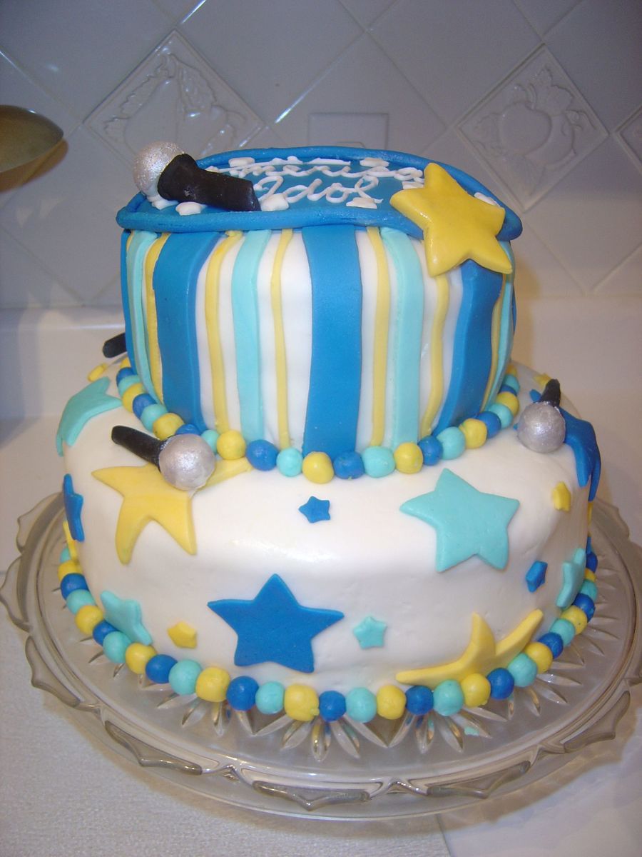 American Idol cake for friend's Birthday. First tiered cake made after Wilton classes. Copied ideas in the gallery. Thanks!