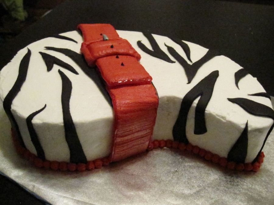 This cake was inspired by my friends birthday dress. She wore a zebra dress with a red patent leather belt. The cake is buttercream with black fondant accents and red buttercream for the belt. Hope you like it.