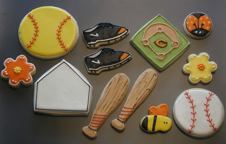 NFSC w/ Antonia74's RI. I made three sets of these cookies for a raffle at a fund-raising golf tournament for my son's high school baseball team and the girl's softball teams this weekend. I'm going to wrap them individually and place them on top of yellow easter grass (the school colors are orange and yellow) in a bakery box with a window.The shoes were handcut from a template I made. The wood "grain" was just Wilton's brown painted on. The idea for the ladybug was inspired by the talented TracyLH. TFL!