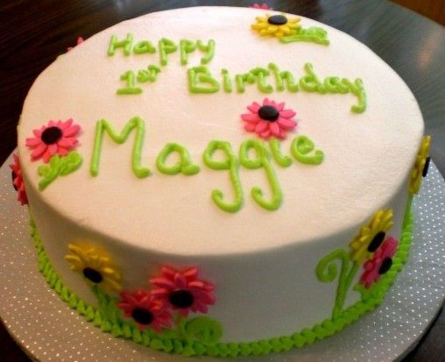 French vanilla cake with vanilla buttercream decorated with 'electric' yellow and pink gumpaste daisies. Thanks for looking!