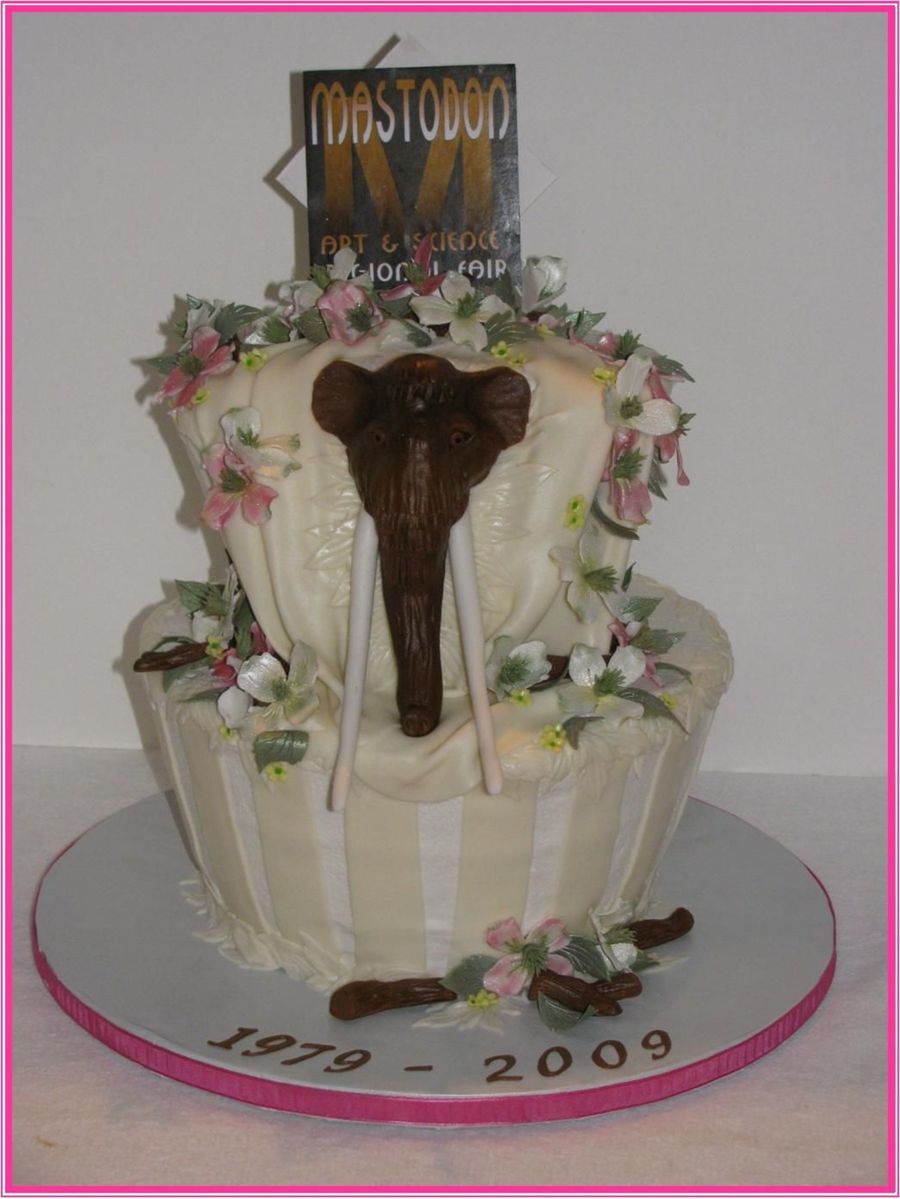 Ok, I've never done a contest before and I'm hoping I at least meet the theme... 30 Years of Mastodon Art & Science Fairs. I sculpted a Mastodon head from fondant and then accented with our state flower the dogwood. I''m sure I'm not botanically totally 100% accurate but that's why I entered as an armature! :) It's a triple layer, two tier, WASC cake with Raspberry Filling and marshmallow fondant accents! Wish me luck!