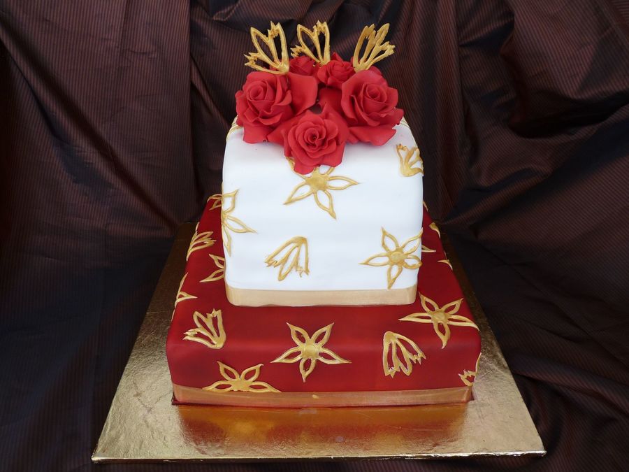 I made this for my hubbys and my 17th wedding anniversary this weekend. the bottom tier is a dummy 10" and the top tier is 2 6" vanilla cakes with cookies and cream filling. roses and decoration all made of fondant.. the gold decorations i used like a patchwork flower cutter and then painted them all with antique gold liquid cake paint. I airbrushed the bottom tier the red. I had a vision and what better excuse to have a play than for ourselves.. I love the finished look